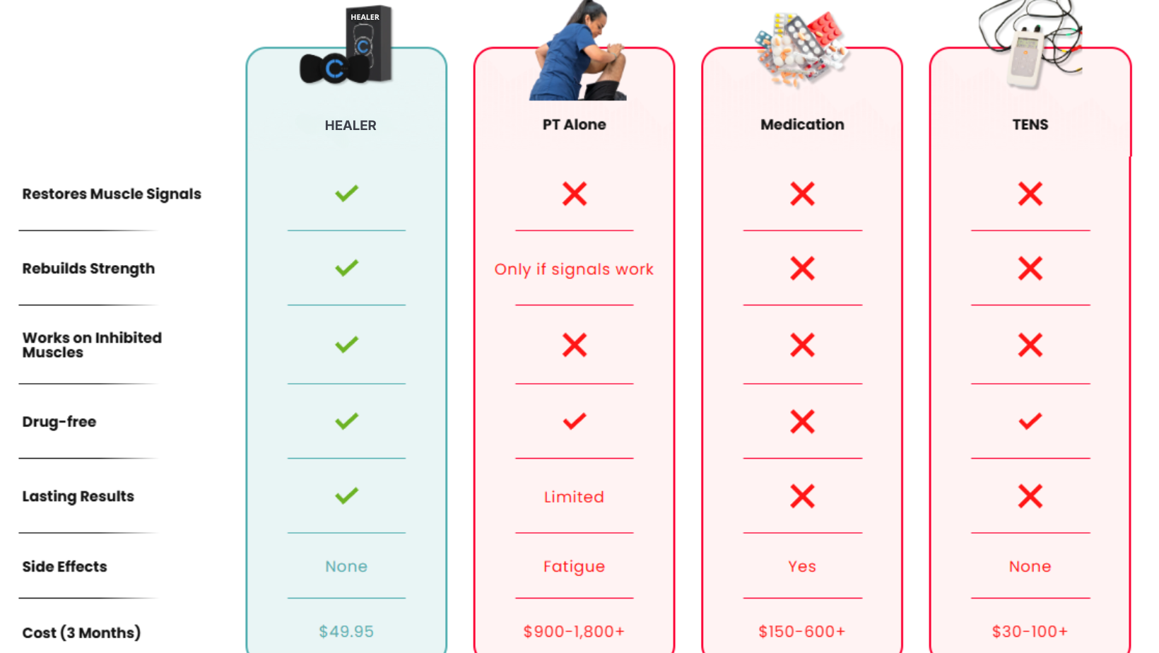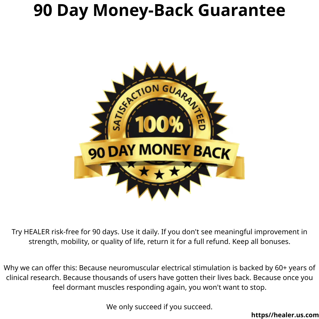 Try HEALER free for 90 days. If you don't see significant improvements in your strength, mobility, or quality of life, return the product for a full refund. Keep all offers. No explanation needed. We also offer a 1-year warranty for your peace of mind.