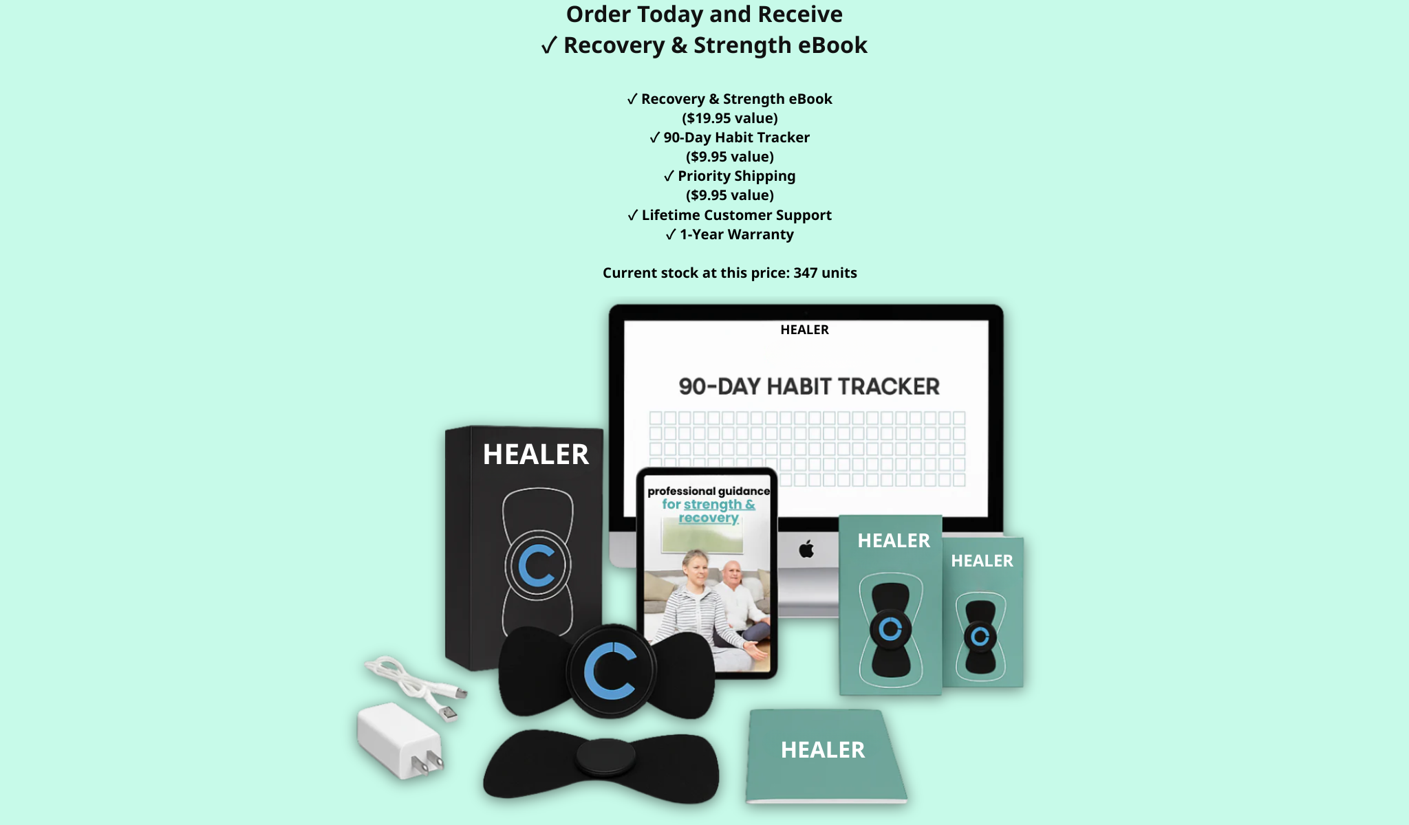 HEALER device, 1 medical-grade pad, USB charging cable, wall adapter, manual, quick-start guide, digital eBook, digital habit tracker.
