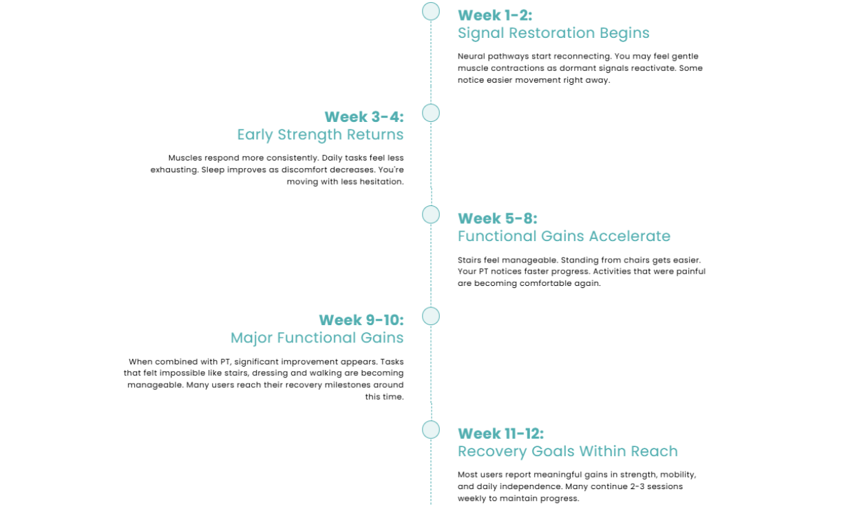 Most users feel muscle activation during their first session. Strength improvements typically begin within 1-2 weeks.Significant functional gains (easier stairs, better PT performance, independent movement) usually occur within 4-8 weeks.
